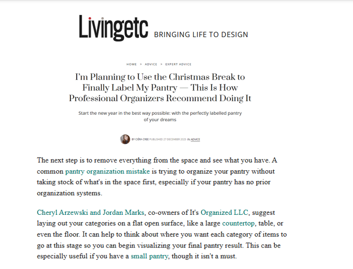 Using the Holiday Break to Organize your Pantry.... Check out this Living Etc article on pantry labeling/organizing ideas, and see our tips below! Read entire article here IT'S ORGANIZEDJanuary 1, 2026 Facebook0 Twitter LinkedIn0 0 Likes