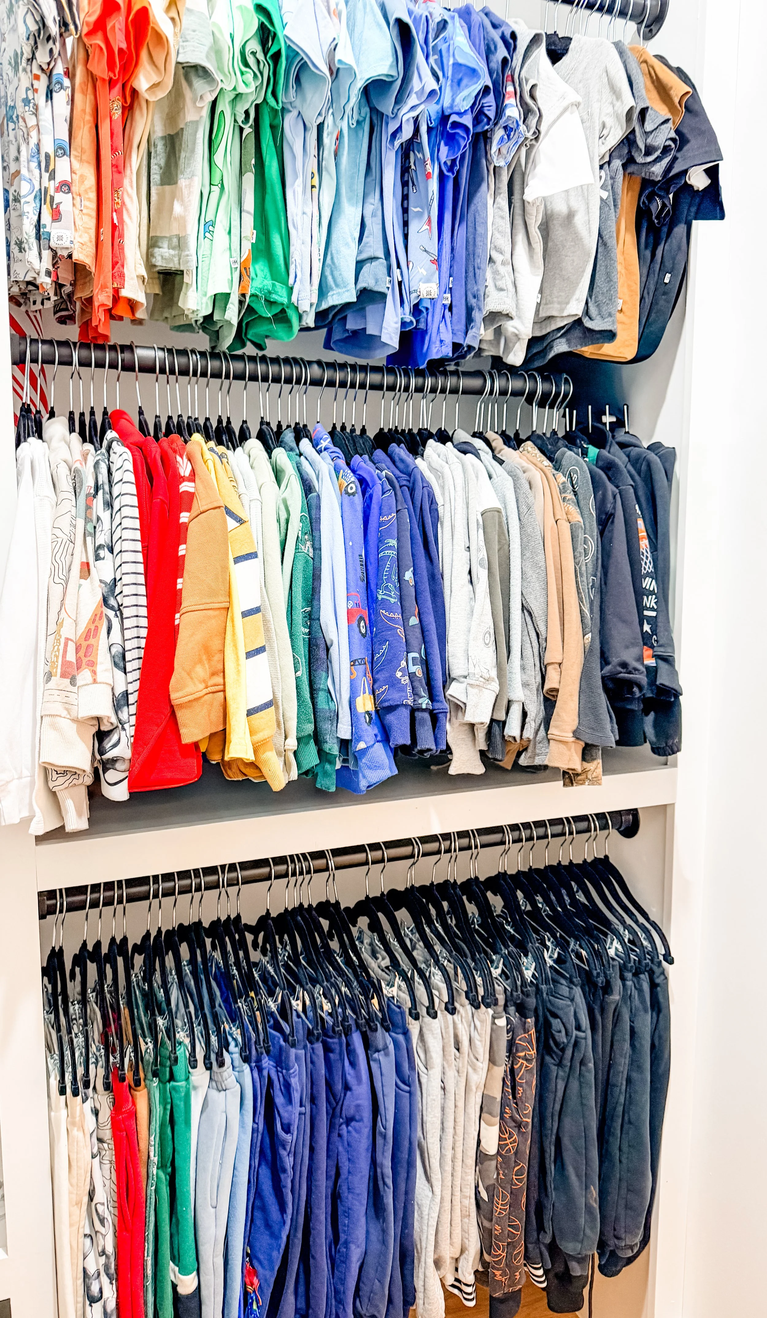 This little boy will have no problem picking outfits in the morning 🌈 We’re big fans of hanging kids’ clothes so they can easily see and choose outfits without messing up drawers/piles. We even had the space to hang the sweatpants, which helps keep everything #organized. 📷 @itsorganized #kids #kidscloset #kidsclothes #liveorganized